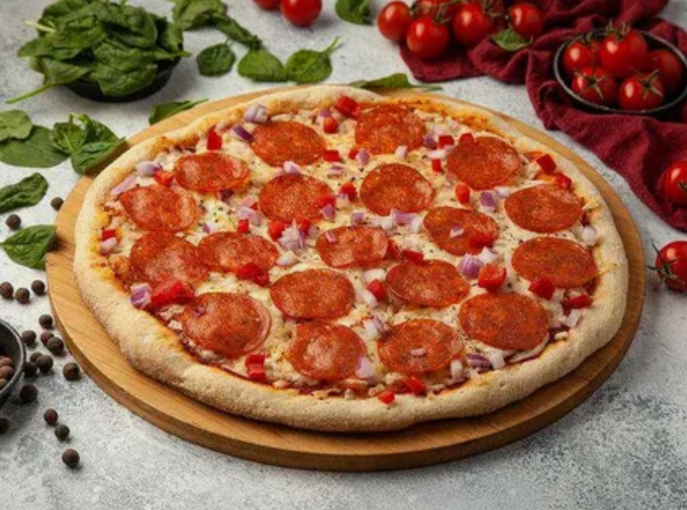 Томатный соус, Моцарелла, Пепперони, Оливковое масло EV, Пармезан