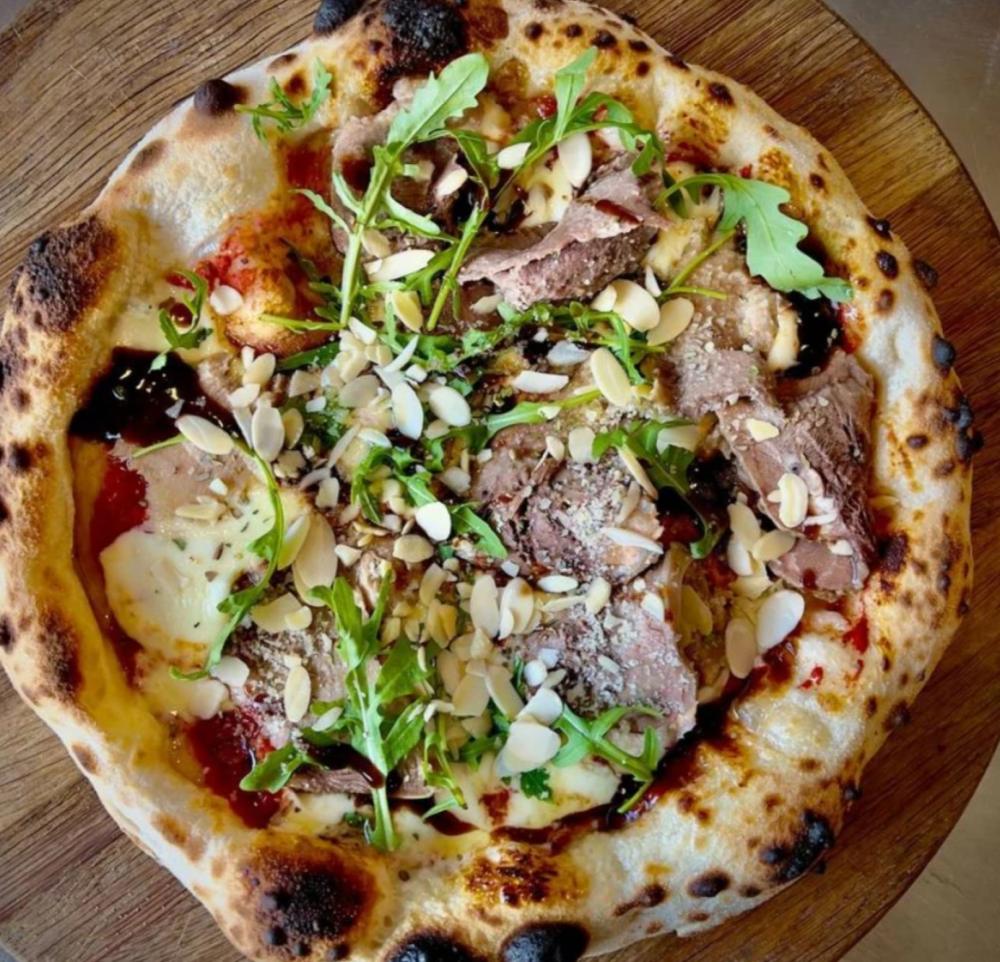 Соус томатный, соус демиглас, моцарелла, томленый говяжий язык, орегано, миндальные хлопья, пармезан, руккола