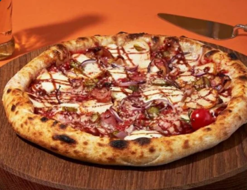 Томатный Соус, Моцарелла, Цыплёнок Гриль, Бекон, Корнишоны, Красный Лук, Соус BBQ, Оливковое Масло EV