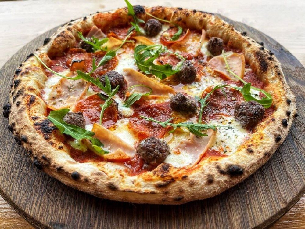 особый соус на основе рубленых томатов, митболлы из мраморной говядины, ветчина Сampana, чоризо, базилик, оливковое масло EV, руккола
