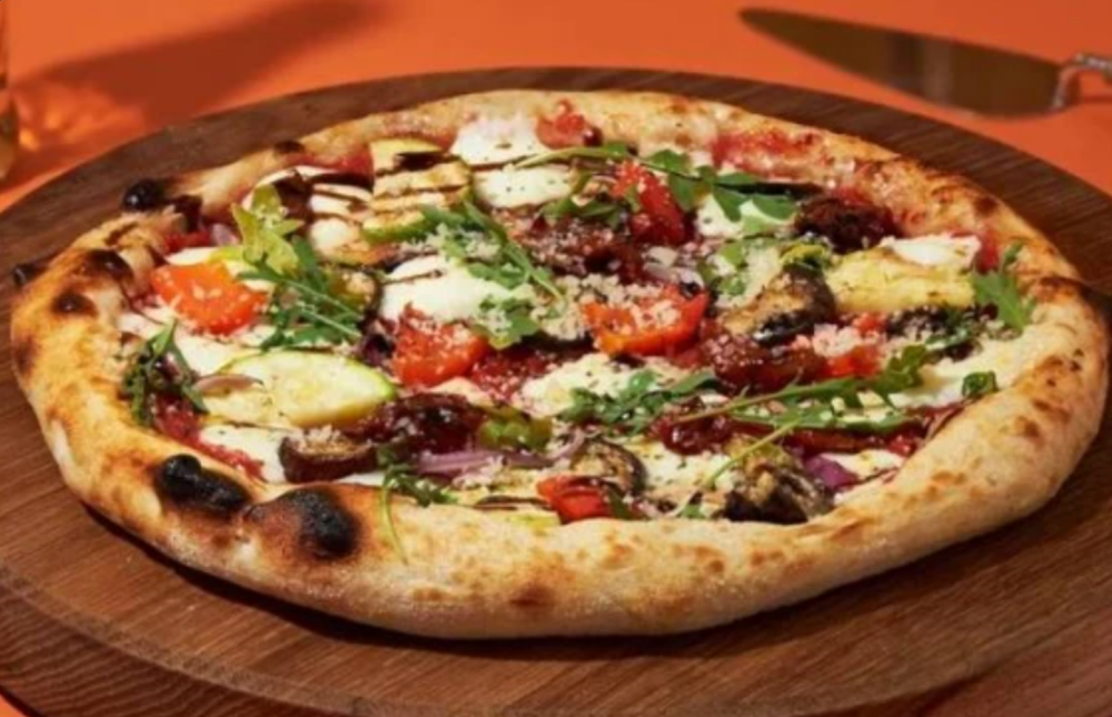 Томатный Соус, Моцарелла, Брынза, Кабачки, Баклажаны, Болгарский Перец, Томаты Черри, Оливковое масло EV, Пармезан, Руккола